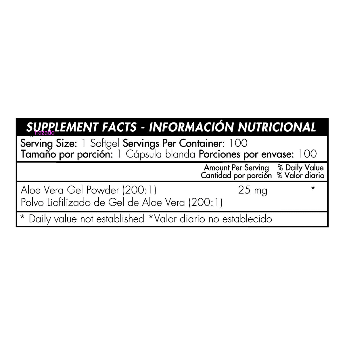 - Cada cápsula contiene 25mg de polvo liofilizado de gel de Aloe Vera.