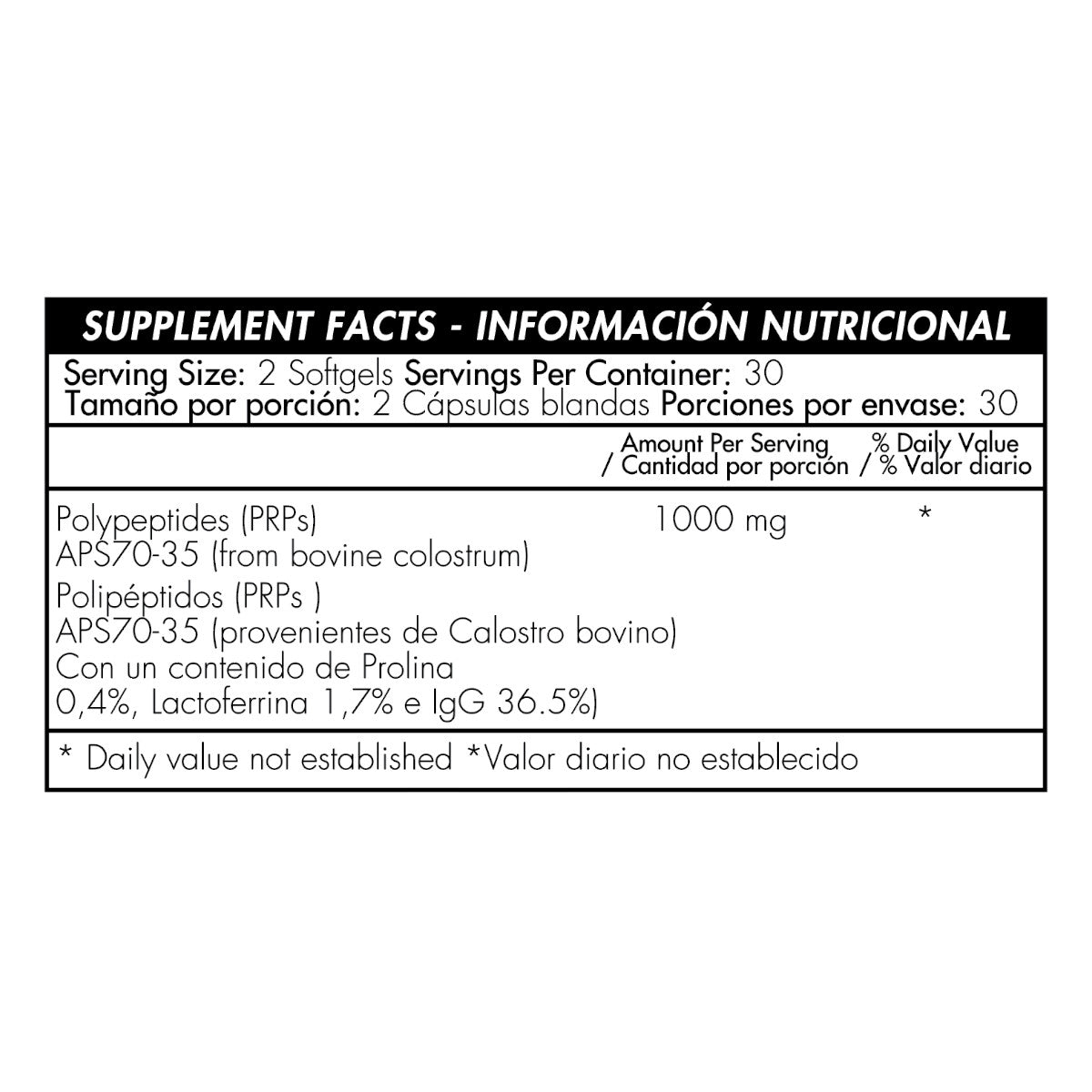 - Cada cápsula contiene 1.000mg de polipéptidos APS 70-35, provenientes de calostro bovino.