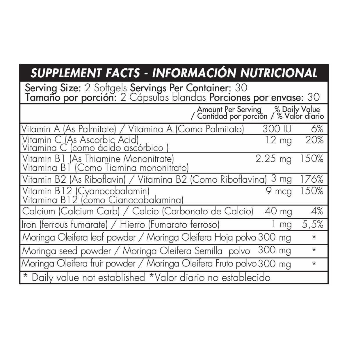 - Cada cápsula contiene una poderosa dosis de Moringa Oleifera junto con vitaminas esenciales como A, C, B1, B2, y B12, así como minerales como calcio y hierro.