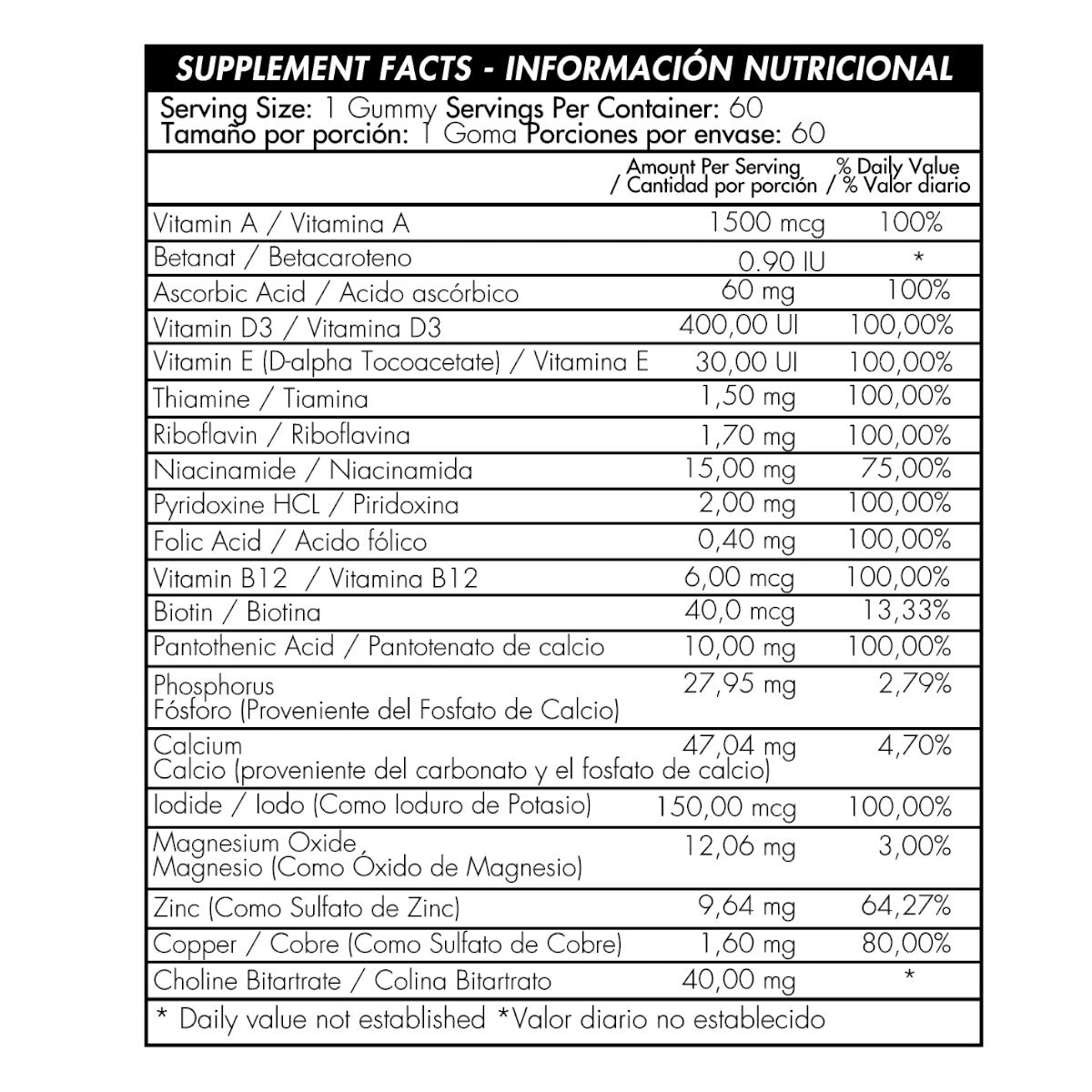 ✅ Completo perfil vitamínico: Vitaminas A, D, E, complejo B y más, todo en una goma masticable.
